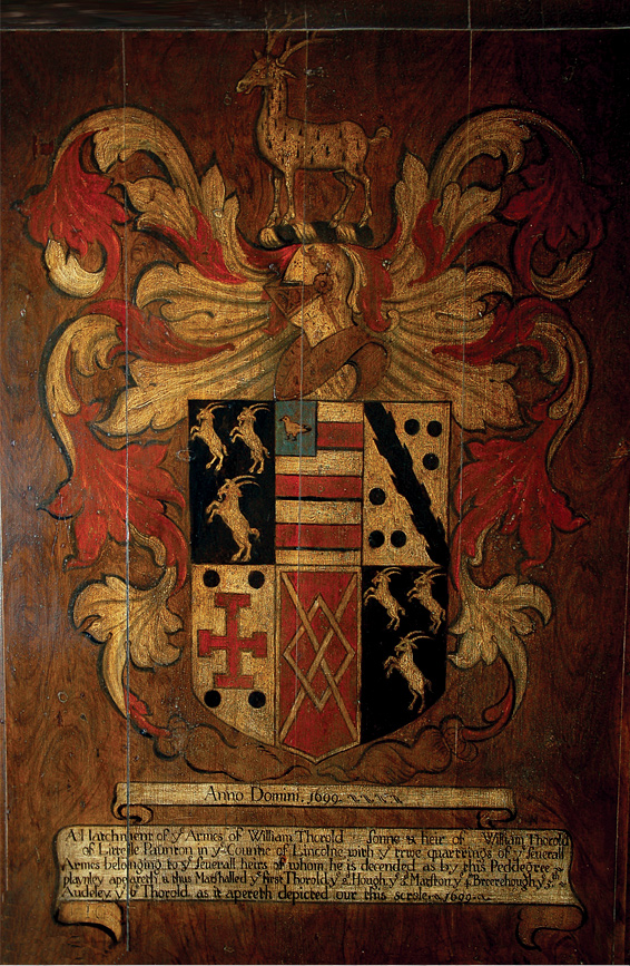 By Tudor times the family was prospering and in 1577 the porch was added with two wings, making it the traditional E -shape, which was the fashion in Elizabethan times. Unfortunately, less than a century later there was a setback in their fortunes. The first serious engagement of the Civil War took place two miles away at Syston Park. On 23rd April 1642 Oliver Cromwell rode over here and set fire to the South Wing. We still find pistol and musket shot in the field. Some time later, to make the house symmetrical, the north wing was taken down and a house built of the stone a few hundred yards down the Barkston Road. William Thorold, a keen Royalist, who lived here at that time was created a Baronet for his part in the Civil War.